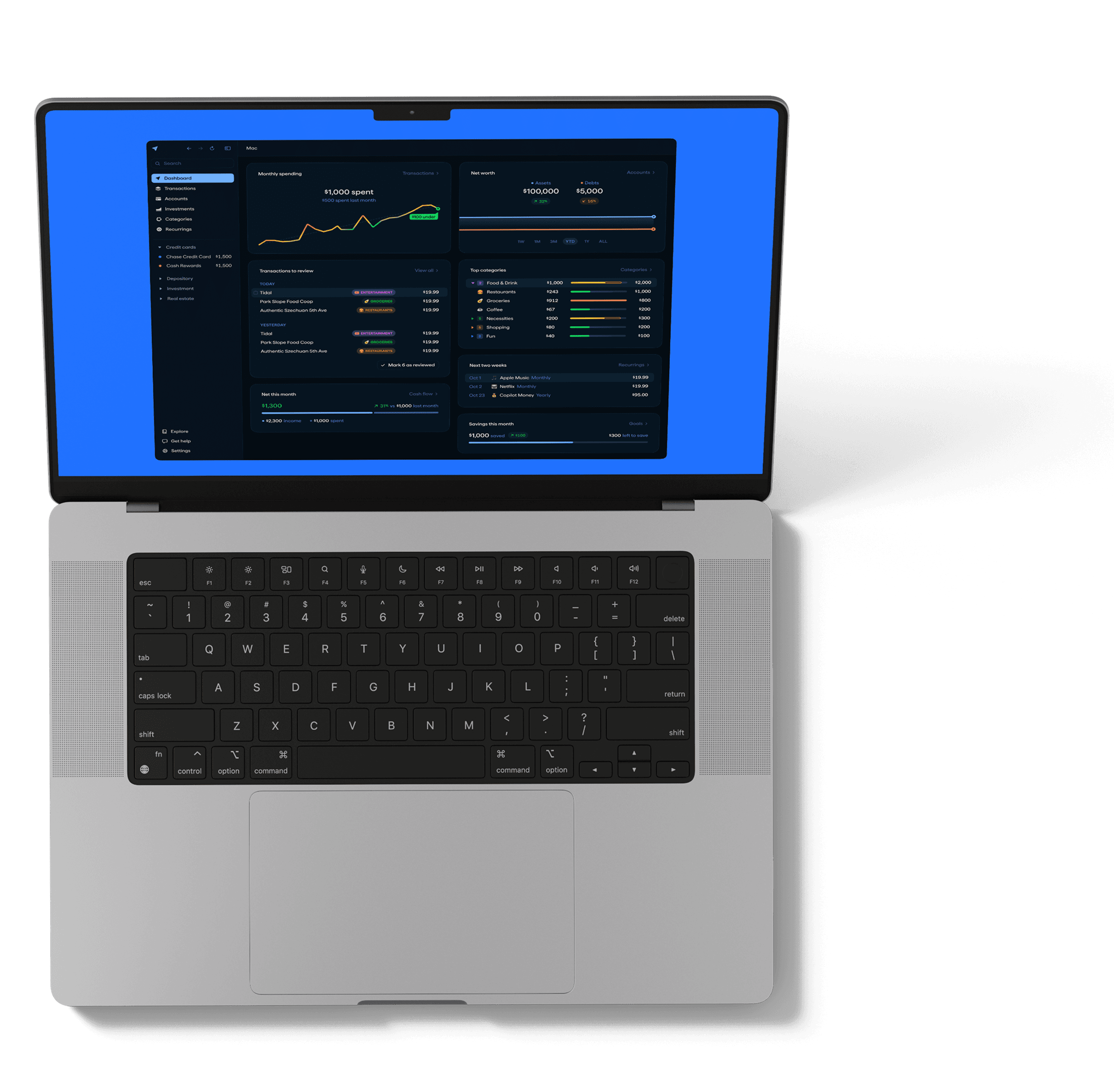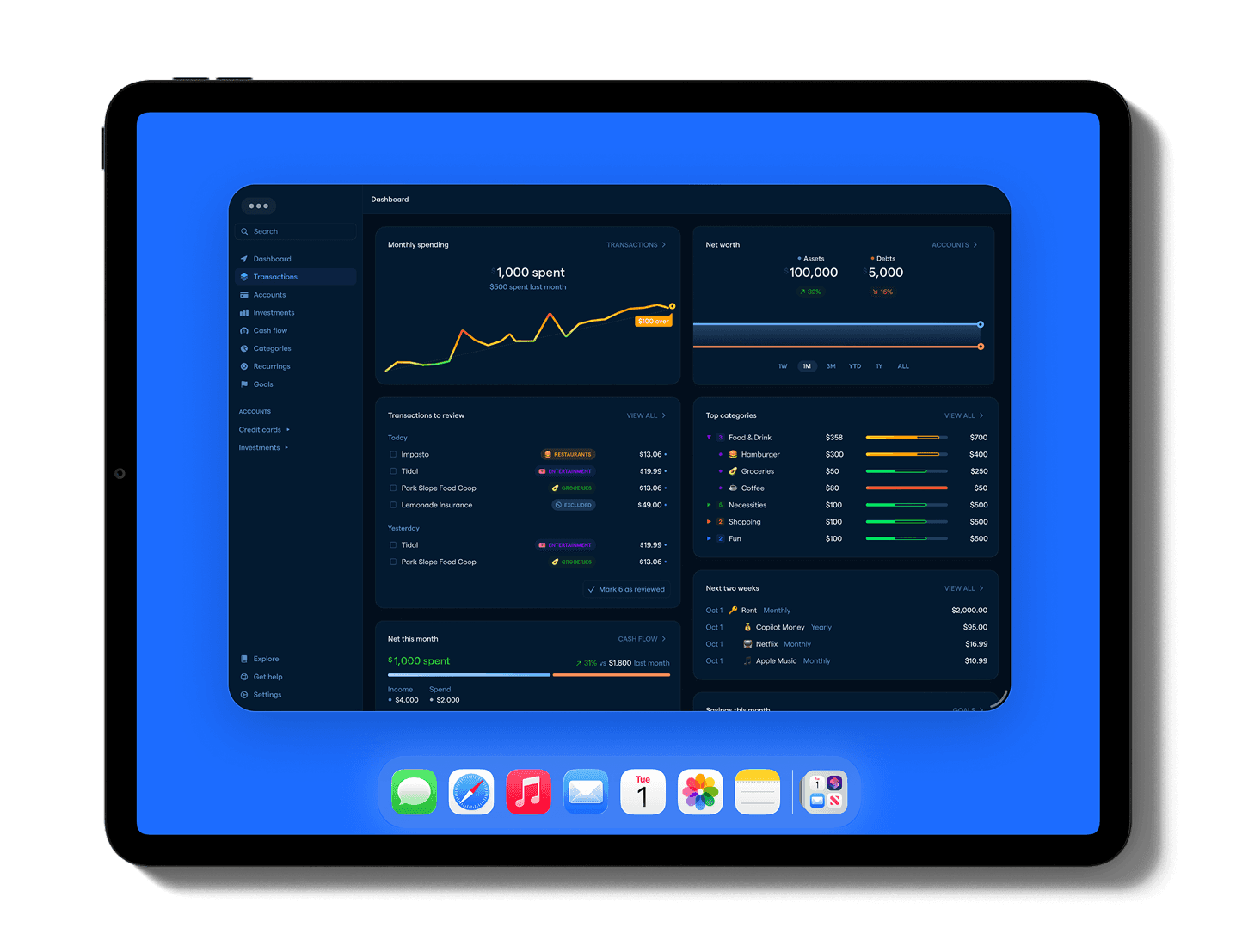 Navigate your finances with confidence. Track spending, budgets, investments, net worth, and get personalized recommendations.